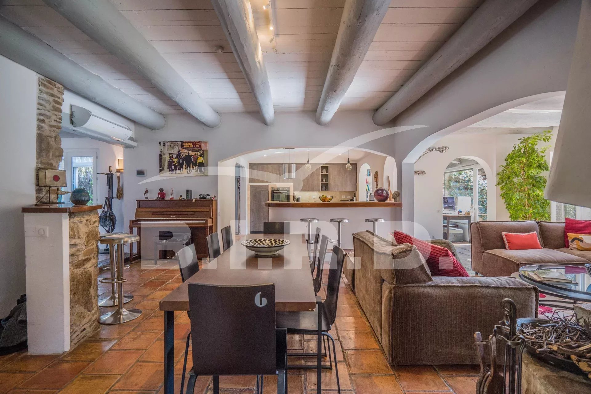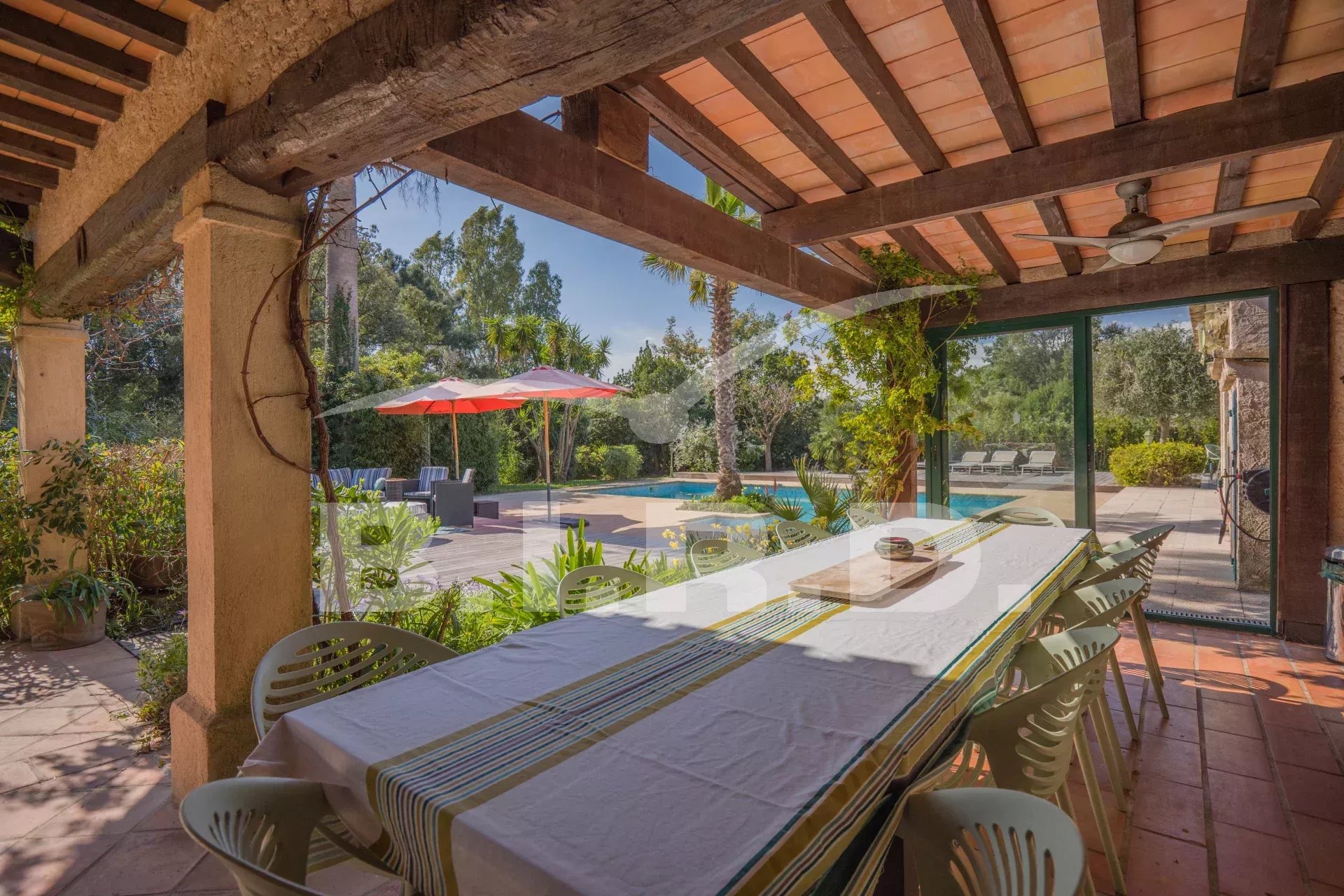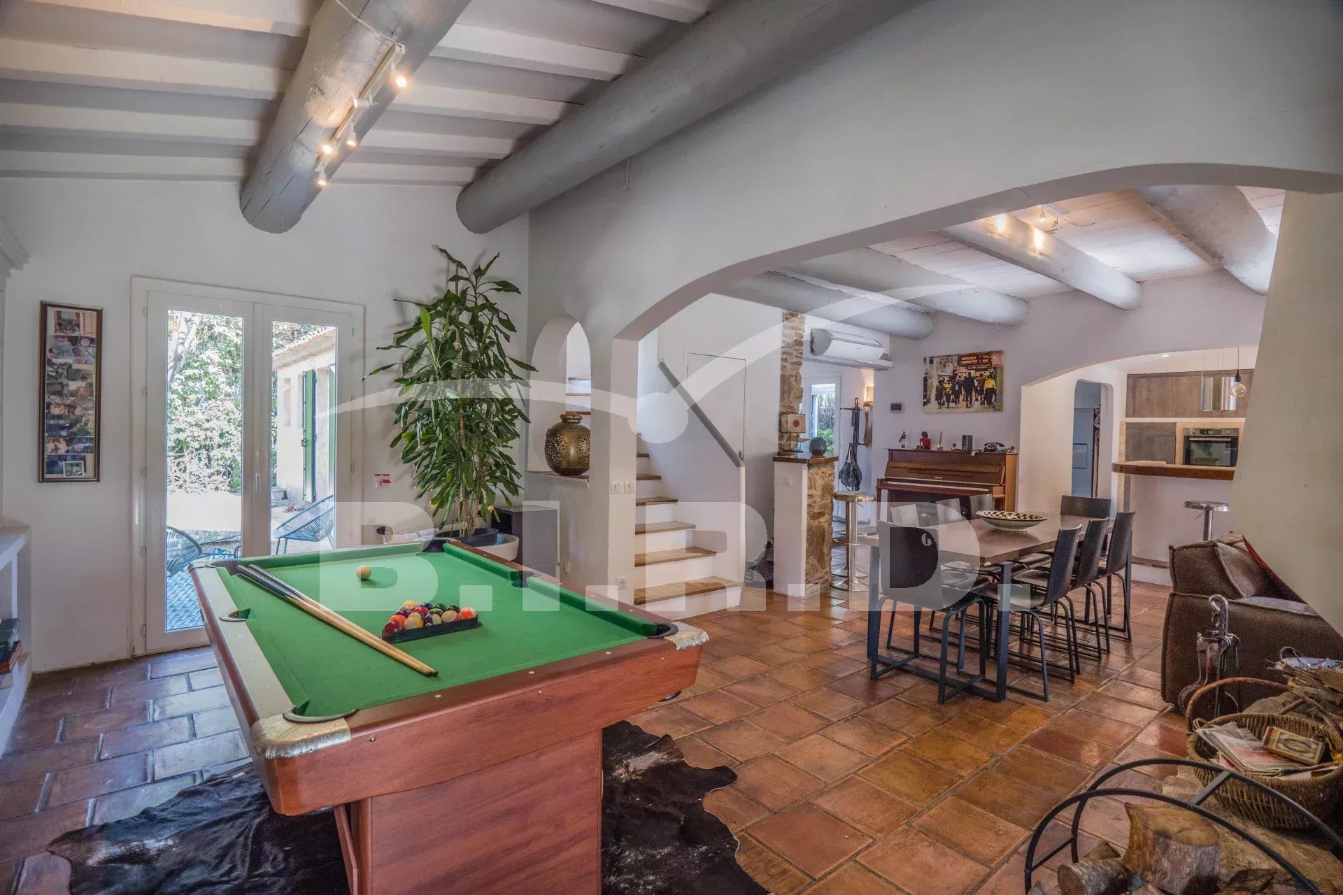 Das Anwesen bietet außerdem eine separate 2-Zimmer-Wohnung, zahlreiche Terrassen, einen schönen Garten mit vielen Obstbäumen, eine Boulebahn und einen großen beheizten Pool.
