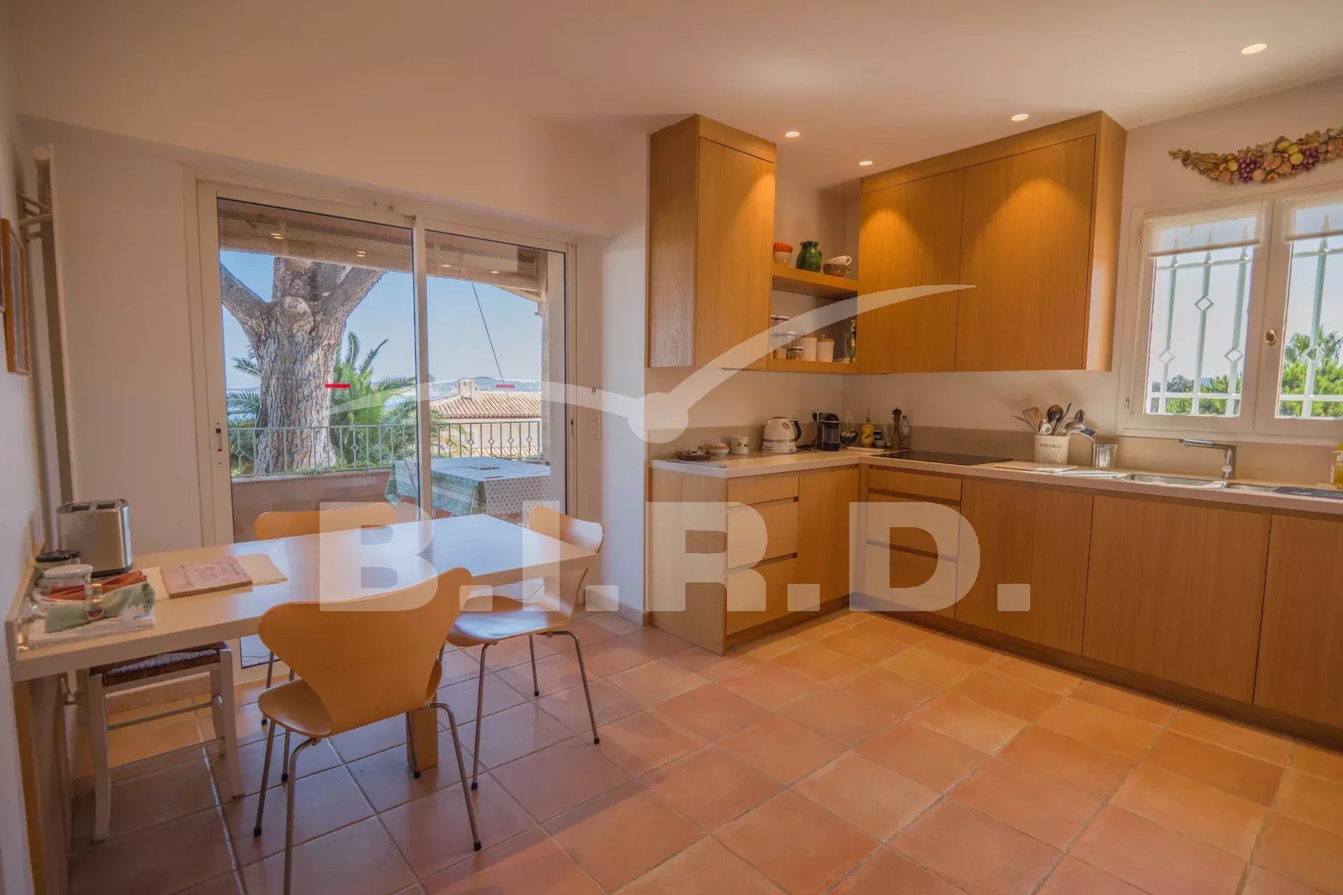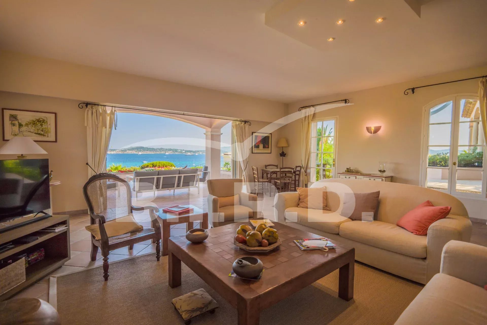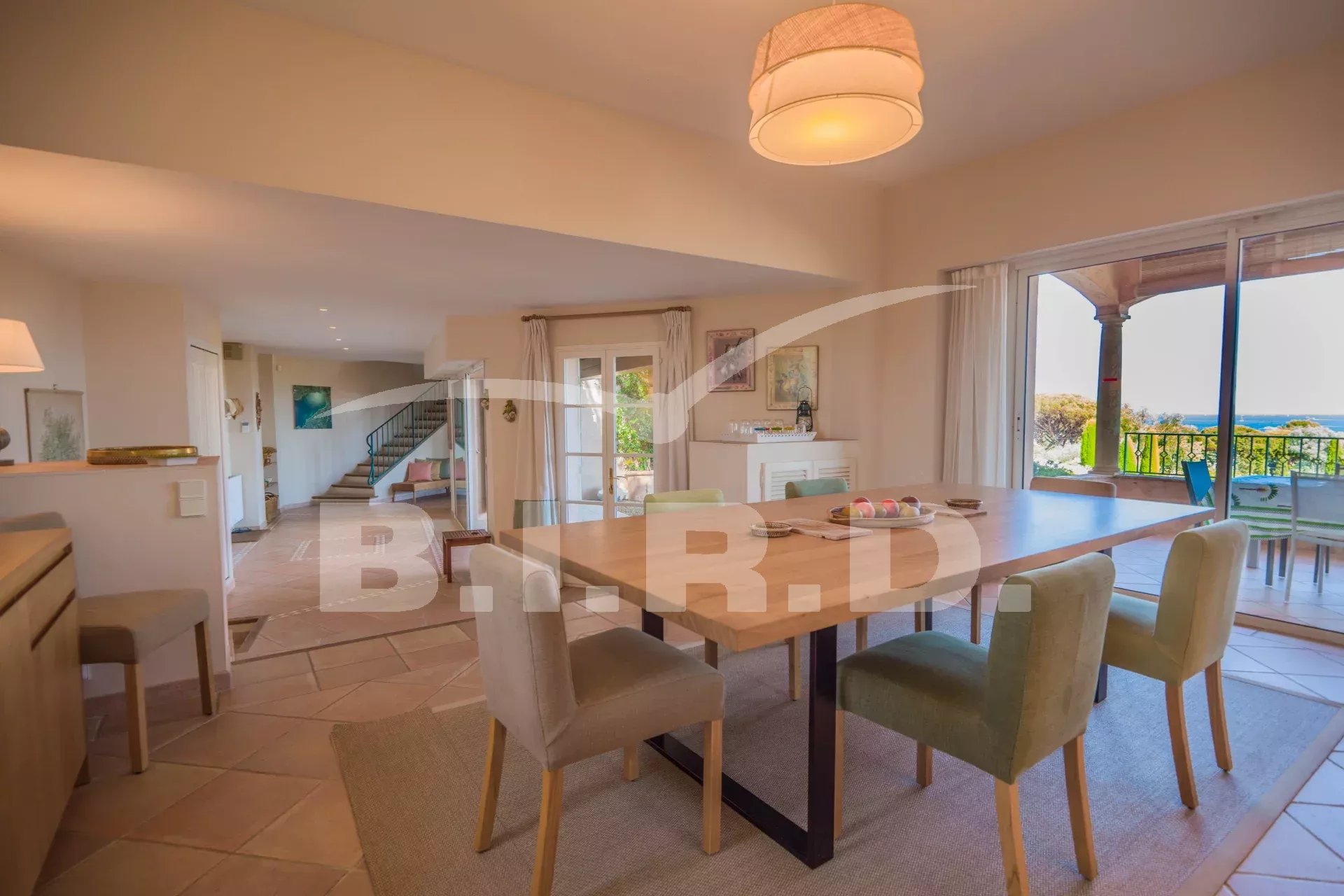 Dès l'entrée, vous serez immédiatement séduits par la vue imprenable sur la mer et Saint-Tropez. Le spacieux salon s'ouvre sur une terrasse couverte, idéale pour admirer ce panorama exceptionnel. La salle à manger et la cuisine semi-ouverte donnent également sur une terrasse ombragée par de majestueux pins parasols centenaires.